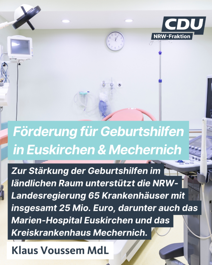 „Mir ist es außerordentlich wichtig, dass Schwangere und Neugeborene überall sehr gut versorgt werden und schnell in gute Hände kommen. Gerade in den ländlichen Regionen wie dem Kreis Euskirchen brauchen wir die kleinen Geburtshilfen und müssen sie gezielt stärken“, so der Euskirchener CDU-Landtagsabgeordnete Klaus Voussem. „Kleinere Geburtshilfen stehen häufig vor finanziellen Herausforderungen, weil sie die Infrastruktur für nicht planbare Entbindungen und Behandlungen an 365 Tage im Jahr vorhalten müssen. Die hohen Vorhaltekosten hierfür machen den Betrieb für die Träger kostspielig.“ Die Fördermittel des Bundes sollen daher genau an die Krankenhäuser verteilt werden, in denen mit maximal 1.100 Entbindungen relativ wenige Geburten pro Jahr stattfinden.